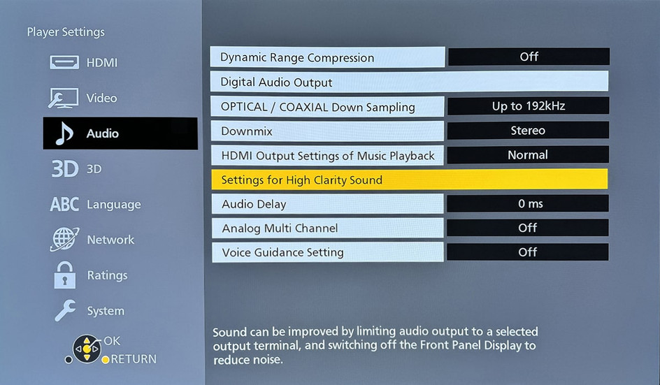 Home > Setup > Player Settings > Audio > Settings for High Clarity Sound
